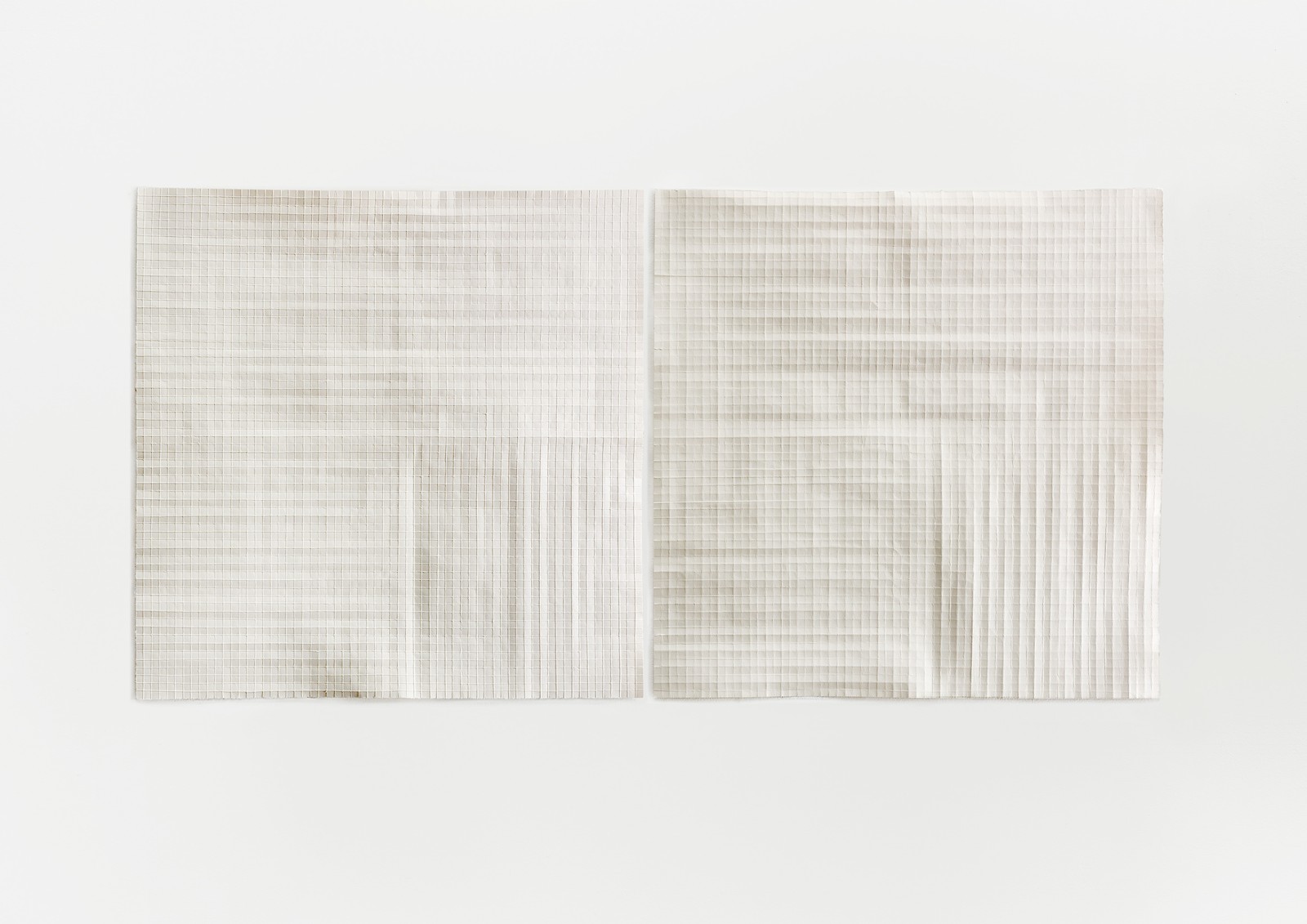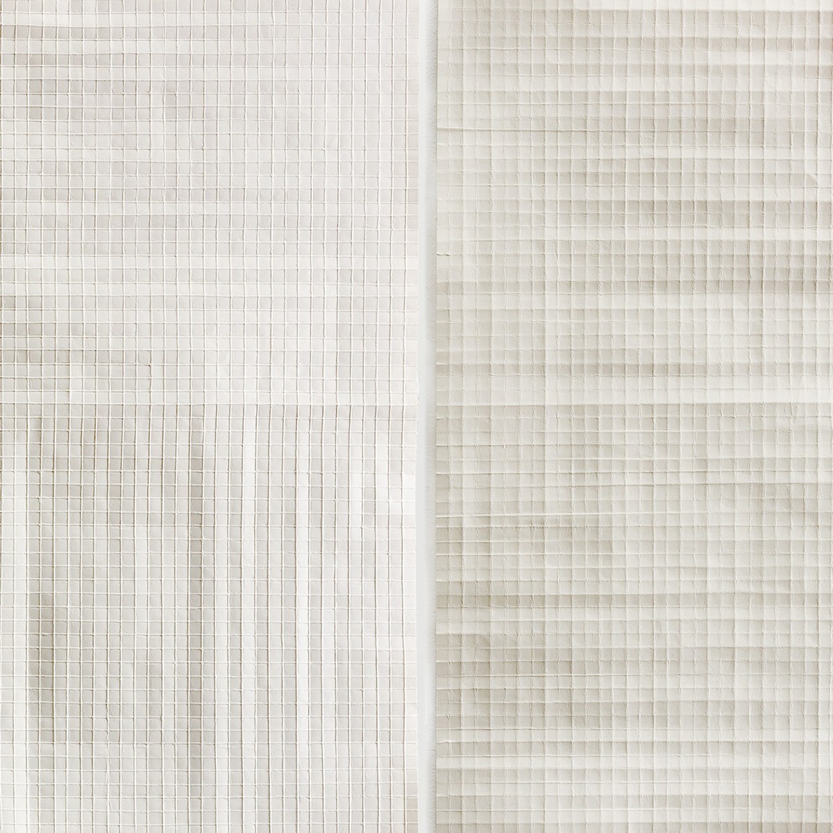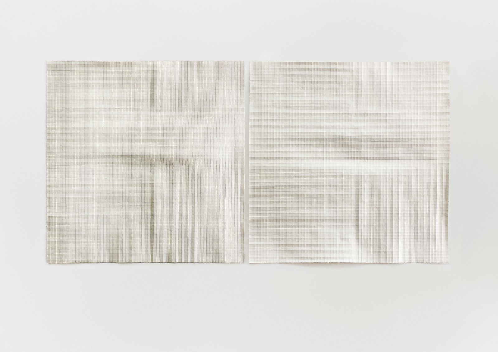 Regelwerk: falte, so schmal wie es mit den Händen möglich ist, horizontal und vertikal das Papier. Fange an, das Papier zu halbieren, dann die Zahl der Faltungen verdoppeln, 2, 4, 8, 16, 32 mal. Da der Falz auf Vor- und Rückseite unterschiedlich wulstig ist, zeige beide Seiten.