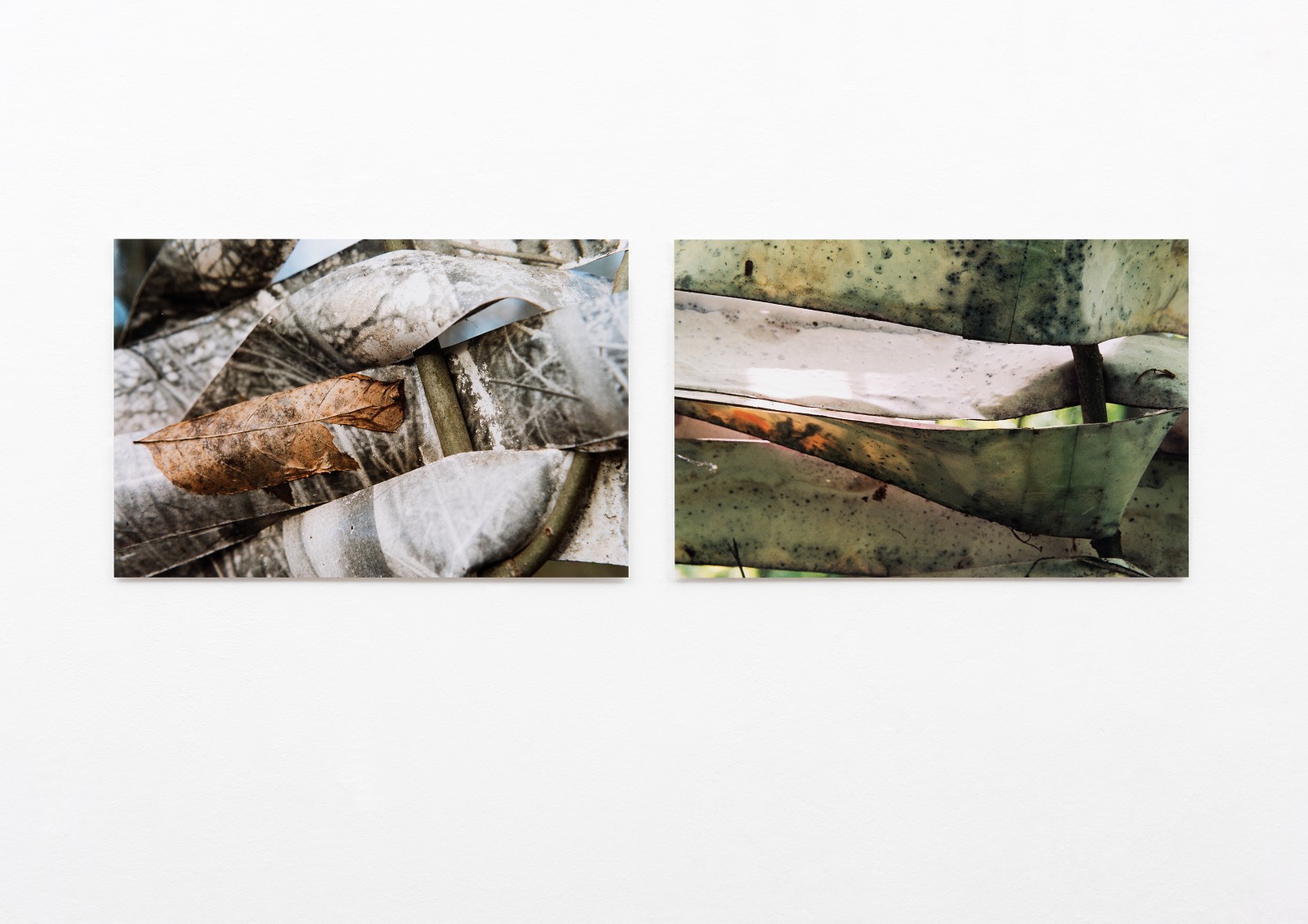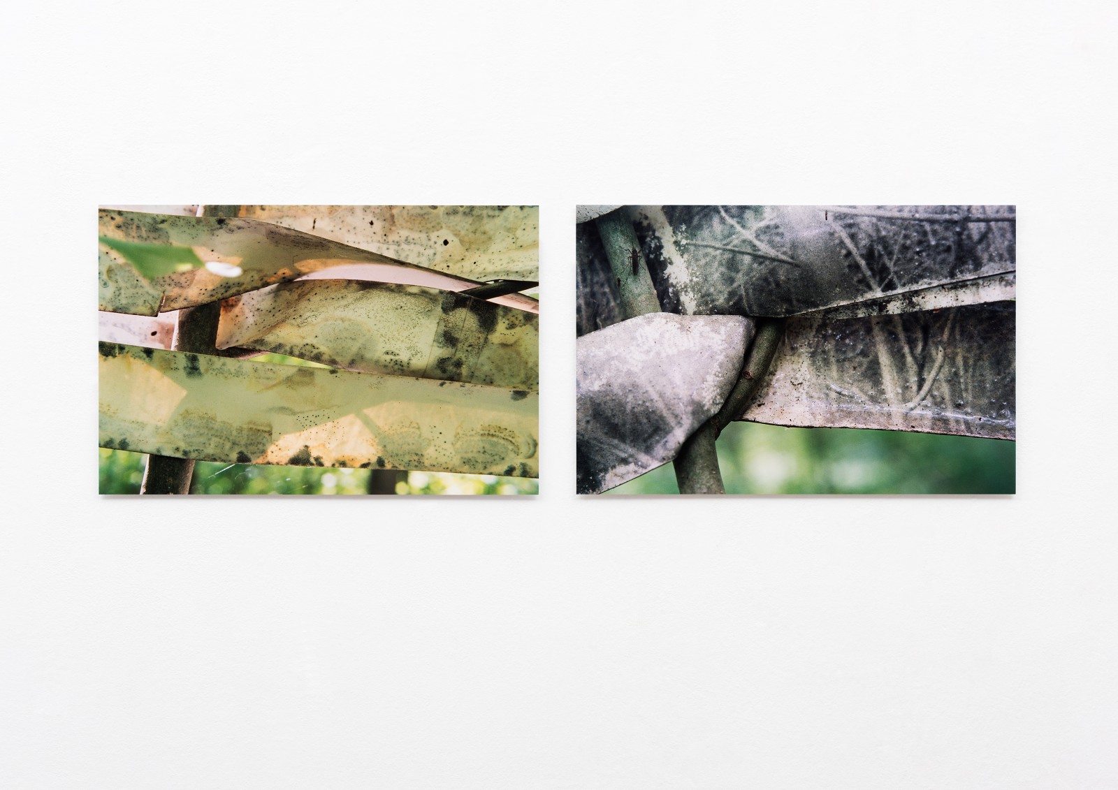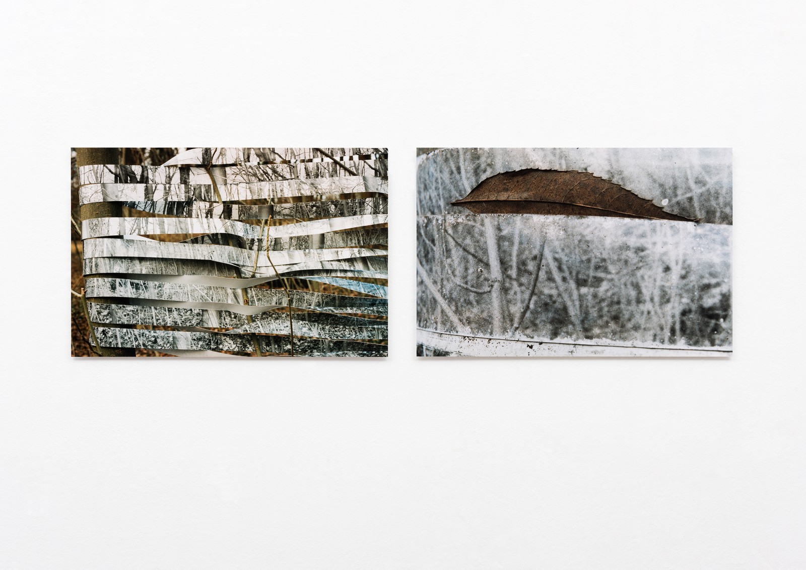 Ich fotografiere einen Ahorneschen-Strauch. Die schwarzweiße Fotografie in der Größe von 60 x 90 Zentimeter schneide ich in Streifen. Diese Fotostreifen flechte ich in den Strauch hinein. Über einen Zeitraum von drei Jahren fotografiere ich Details der Flechtung im Strauch zu den verschiedenen Jahreszeiten.