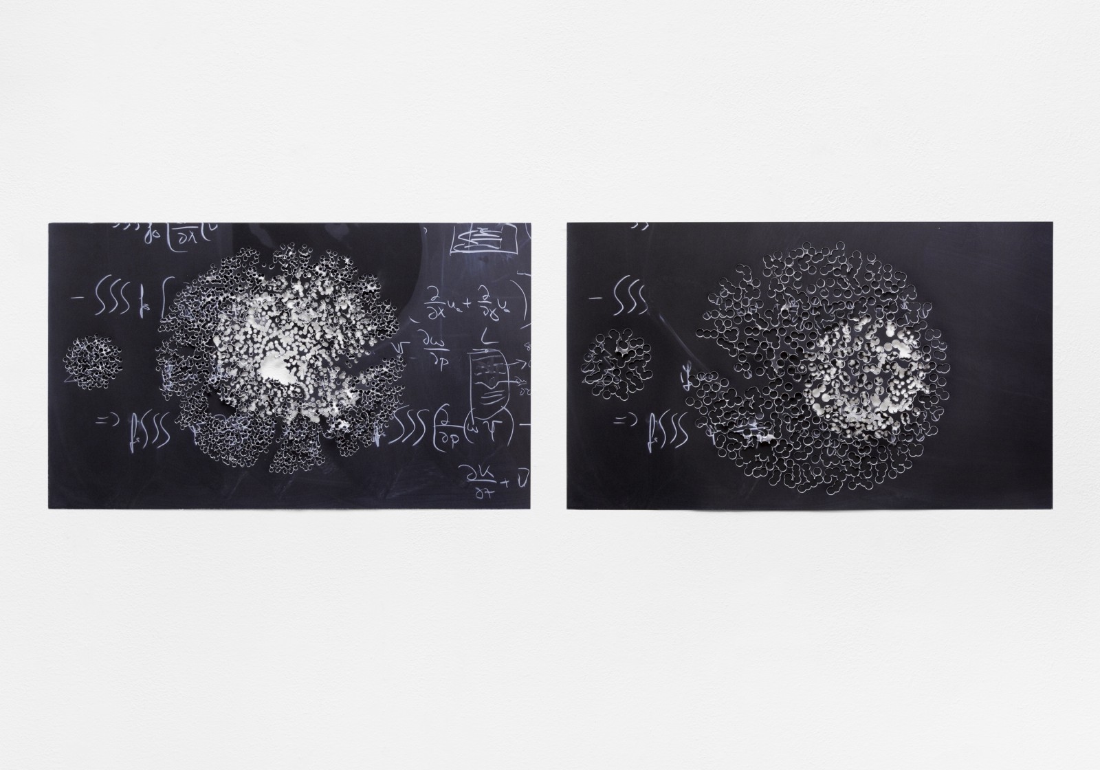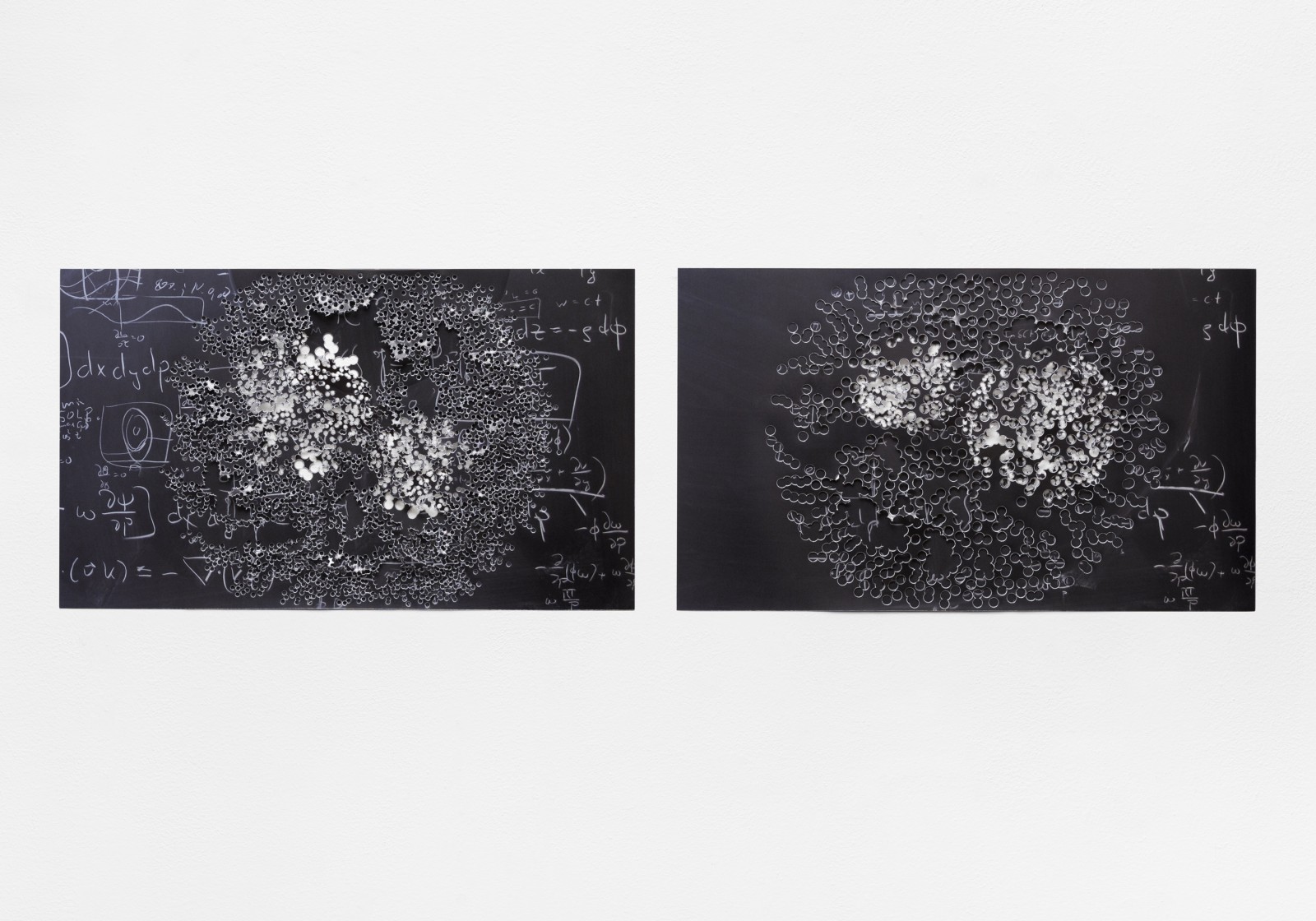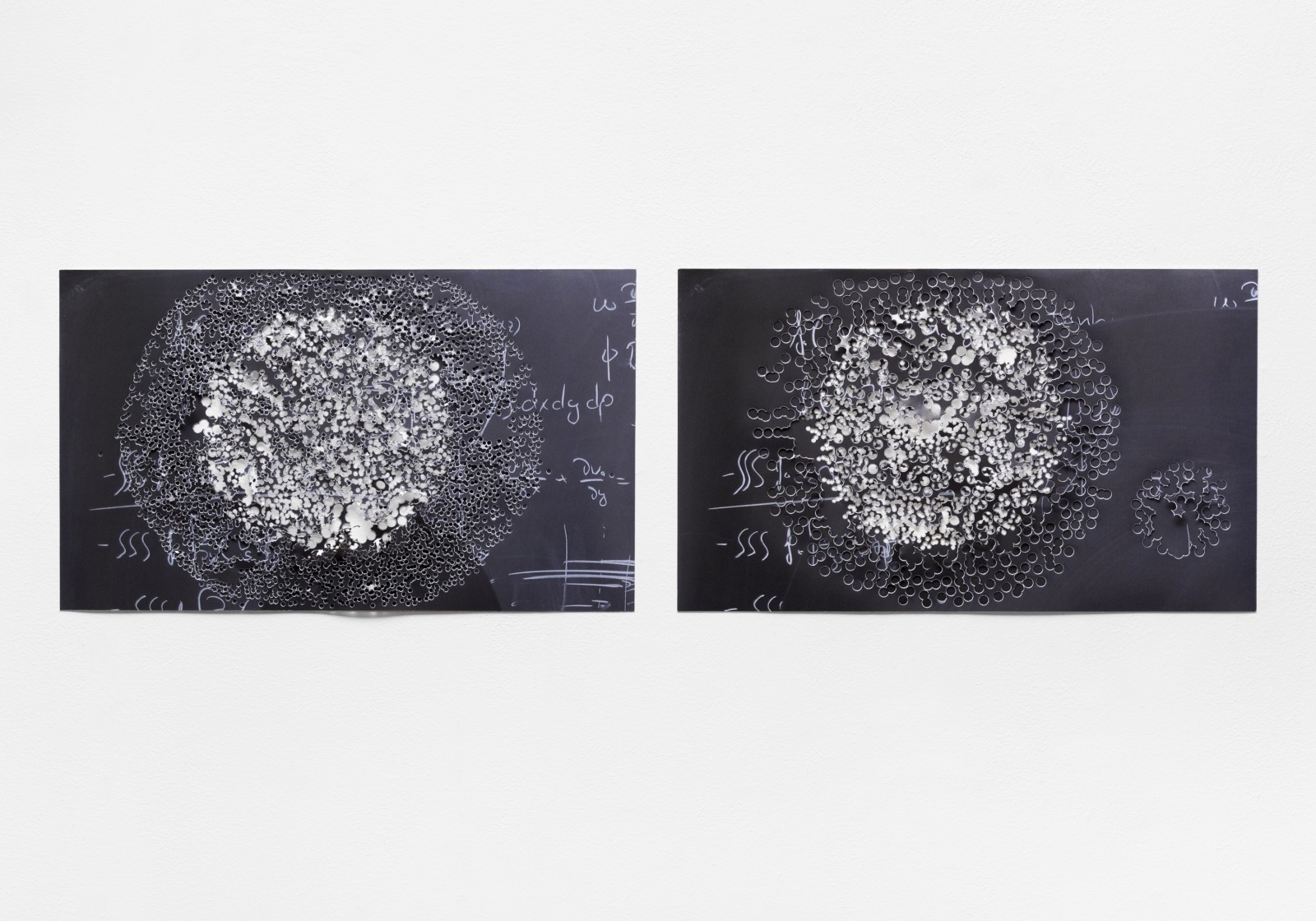 Ich loche mit zwei unterschiedlich großen Stanzeisen in Fotografien der Tafelzeichnungen runde Formen. Jeweils zwei gelochte Fotografien lege ich übereinander.
