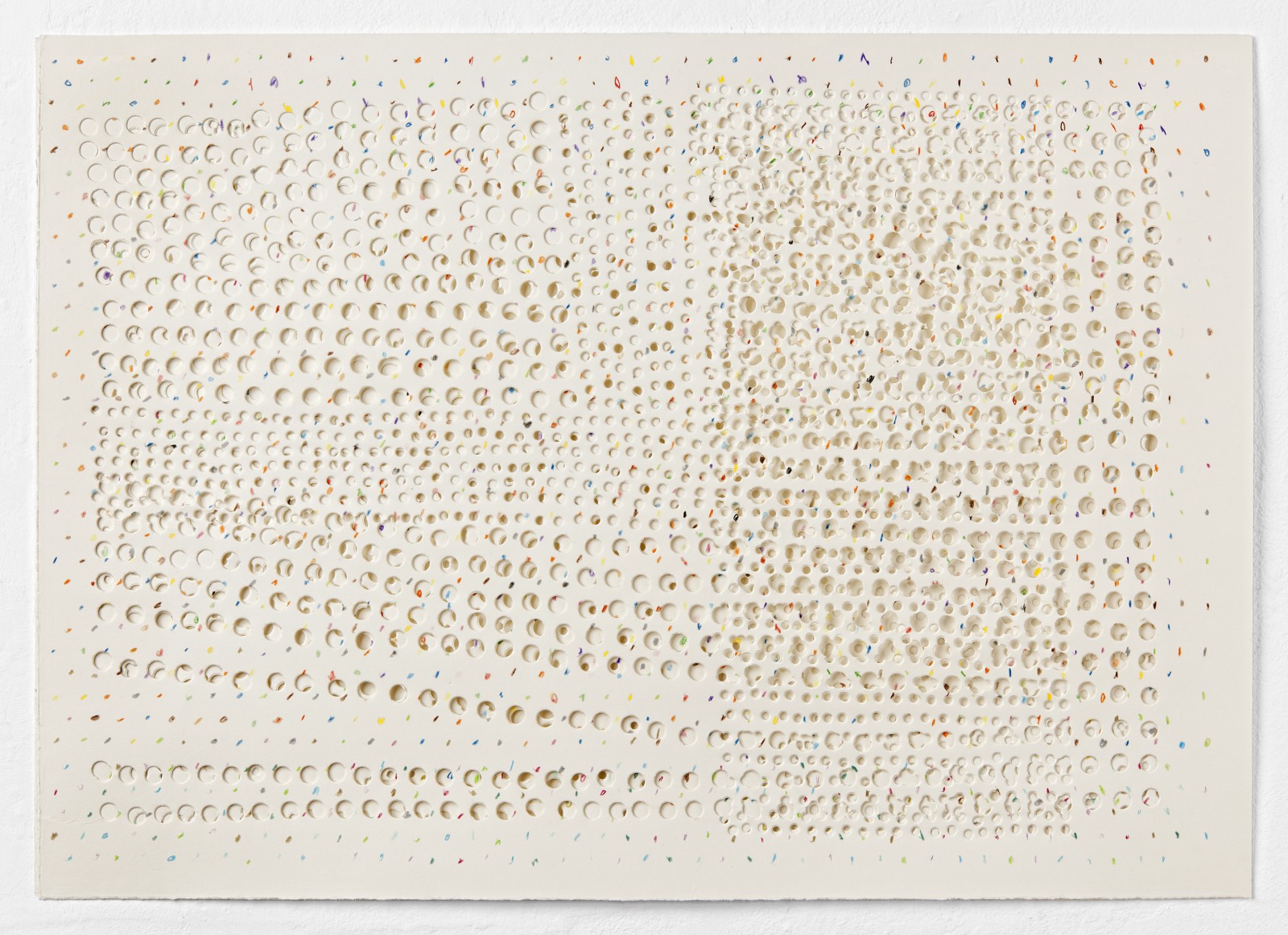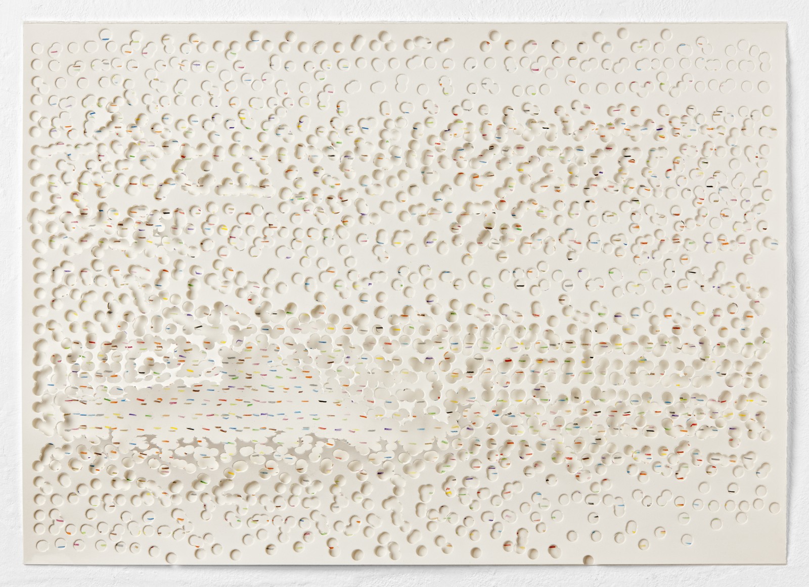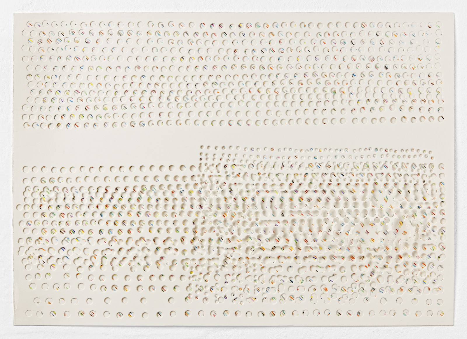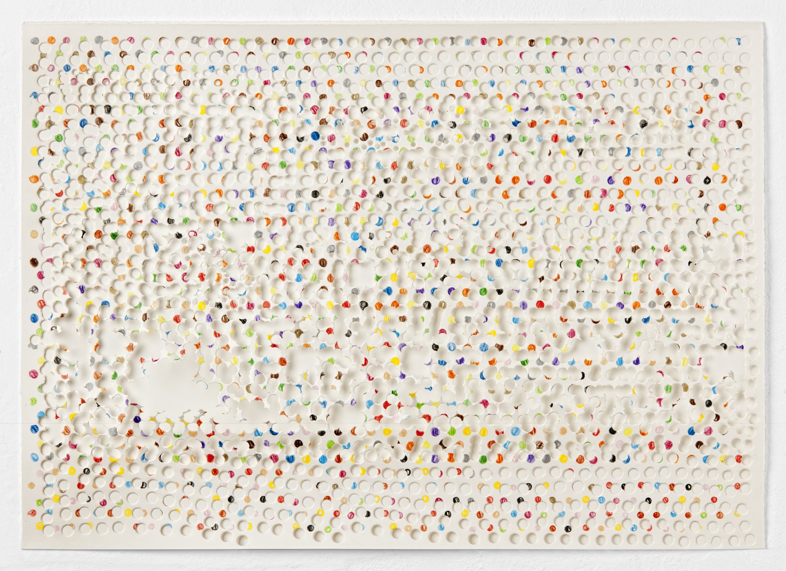 Diese Überlegungen bewogen mich zu einer neuen Vorgehensweise: Ich fertigte eine farbige Zeichnung mit allen Buntstiften aus meinem Zeichenkasten an – in loser Assoziation zum Thema der menschlichen Vielfalt. Darüber legte ich ein perforiertes Papier. Der Blick des Betrachters wird so durch das Loch auf die darunterliegende Zeichnung gelenkt, während zugleich andere Bereiche der Zeichnung verdeckt sind. Nach diesem Prinzip, zwei Papiere übereinander (eine farbige Zeichnung und ein perforiertes Papier), entwickelte ich eine Serie von 23 Arbeiten.
