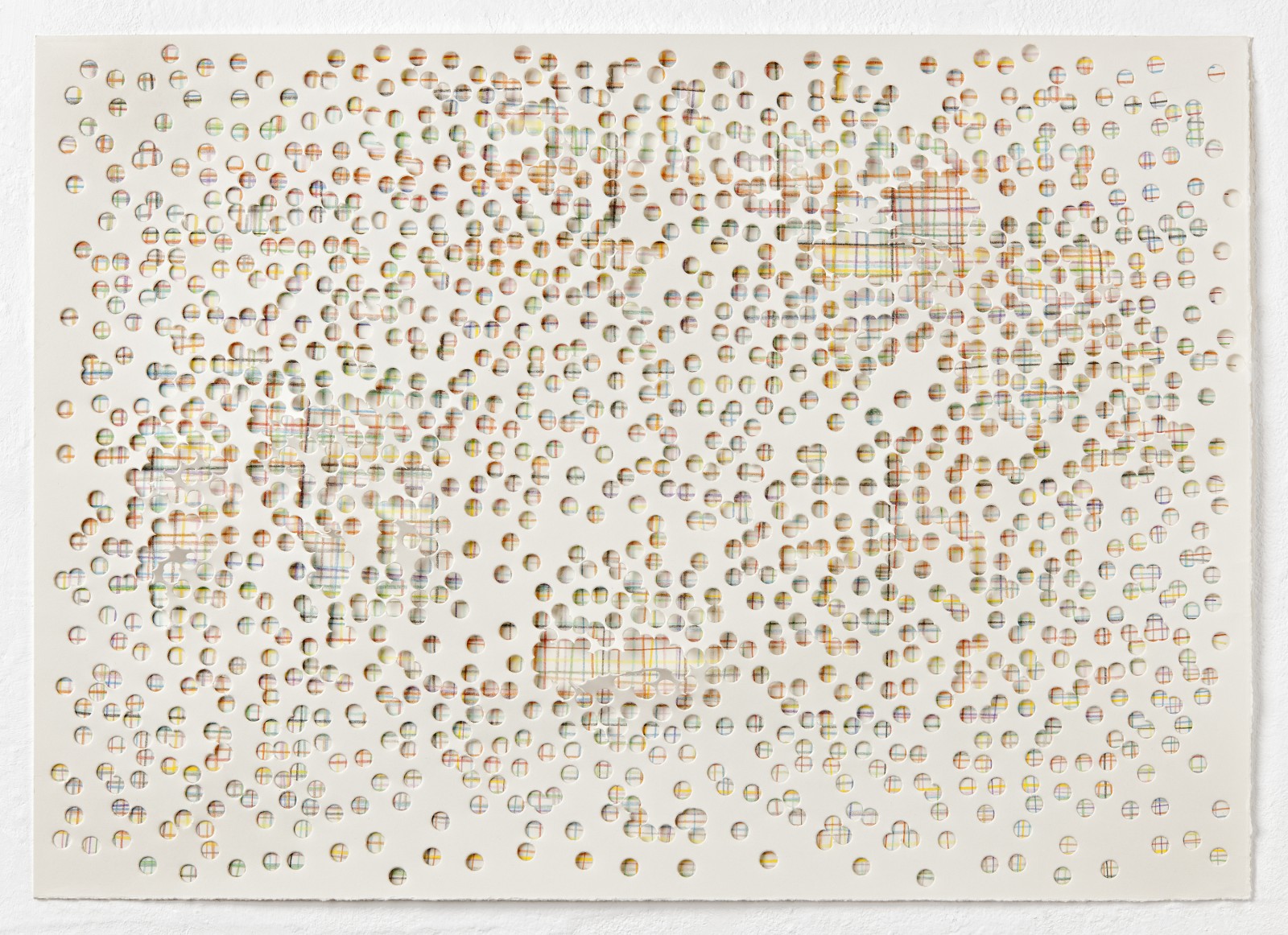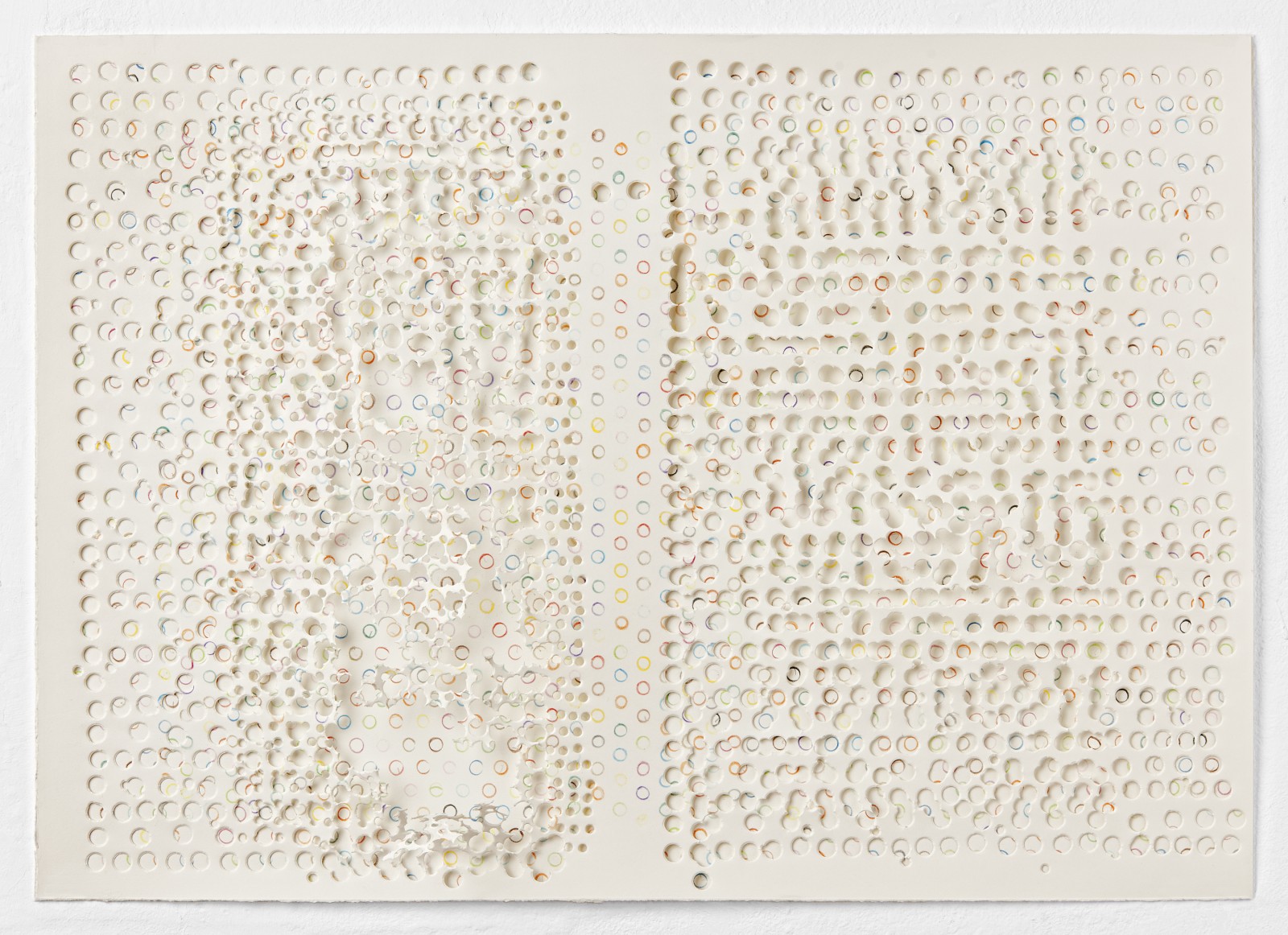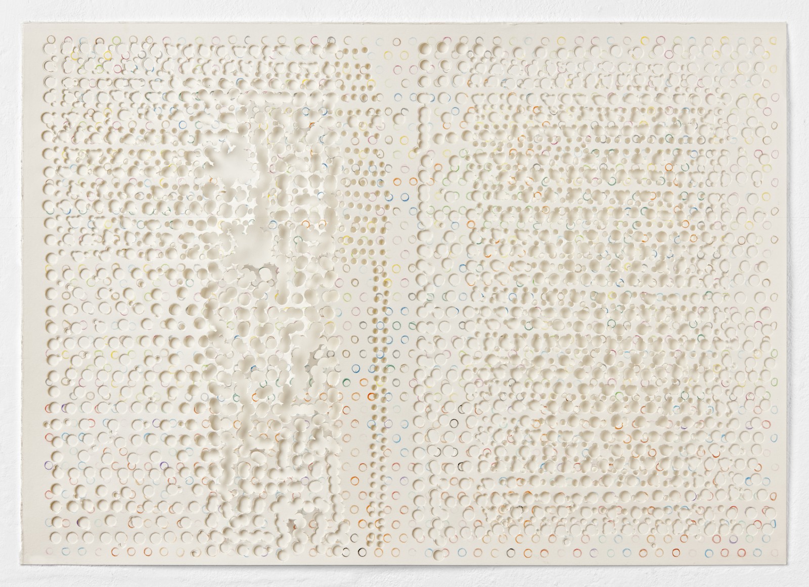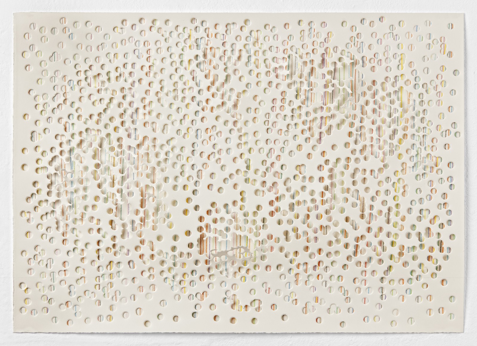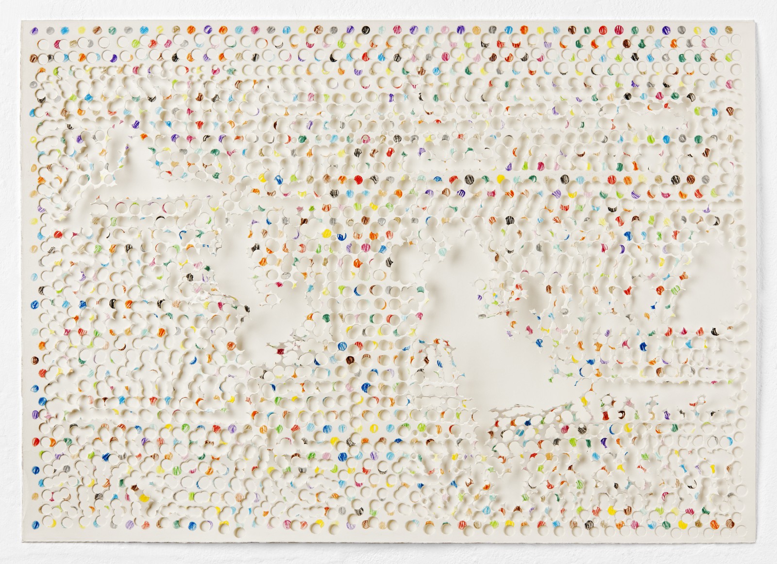 Diese Überlegungen bewogen mich zu einer neuen Vorgehensweise: Ich fertigte eine farbige Zeichnung mit allen Buntstiften aus meinem Zeichenkasten an – in loser Assoziation zum Thema der menschlichen Vielfalt. Darüber legte ich ein perforiertes Papier. Der Blick des Betrachters wird so durch das Loch auf die darunterliegende Zeichnung gelenkt, während zugleich andere Bereiche der Zeichnung verdeckt sind. Nach diesem Prinzip, zwei Papiere übereinander (eine farbige Zeichnung und ein perforiertes Papier), entwickelte ich eine Serie von 23 Arbeiten.