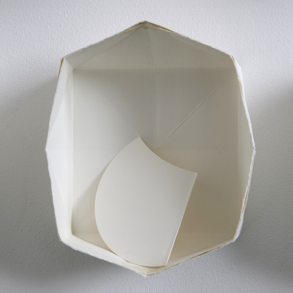 I punch out a small and a larger circle from each of these folded and then smoothed out papers. Doing this, I ask myself: What is important? Concentration on the object, or on what surrounds it? I place the punched-out circles into containers that I have folded using the same type of paper.